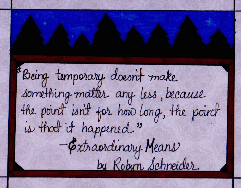“It was as thought I’d gone off on epic adventures, chased down fireworks and buried treasure, dance to music that only I could hear, and had returned to find that nothing had changed except for me.” He seems sad about this revelation… but it seems to me to be a good thing at this point in his life. He’s simply growing up — unfortunately, no one else is. And even though he seemed to think Cassidy was the reason for his sudden maturity and self-realization, she was’t. “She lent a spark, perhaps, or tendered the flame, but the arson was mine. Oscar Wilde once said that to live is the rarest thing in the world, because most people just exist, and that’s all. I don’t know if he’s right, but I do know that I spent a long time existing, and now, I intend to live.”