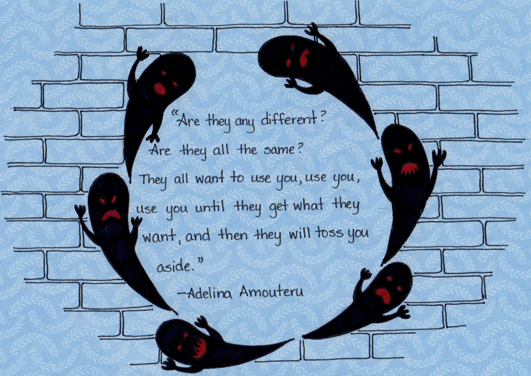 Yet it is her affinity toward dark emotions that strengthen her. She basks in fear and anger and danger. She is one twisted sixteen-year-old, for sure. But she also wants to belong, she wants to be loved, she wants to be accepted by friends — she simply wants people who will be kind to her without expecting something in return. There is so much loss for Adelina, so much fear of trusting others — so much desire to hurt others as she’s been hurt in return.